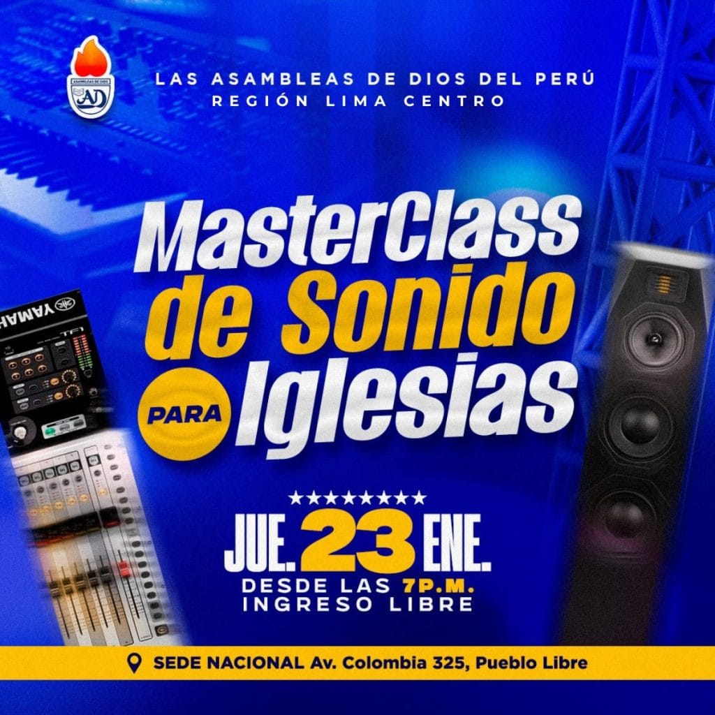 🔊 Jueves 23 de enero a las 7:00 PM, tienes una cita en la sede nacional de LADP (Av. Colombia 325, Pueblo Libre) para la Master Class de Sonido para Iglesias, un evento organizado en conjunto por el Departamento Nacional de Comunicaciones de las Asambleas de Dios del Perú y la Región Lima Centro.