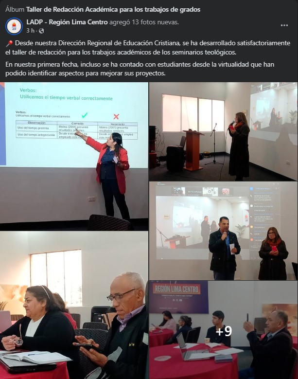 Los días 5, 12 y 19 de julio pasado, nuestra Dirección Regional de Educación Cristiana, ha llevado a cabo con gran éxito el «Taller de Redacción Academíca» dirigido a estudiantes de los seminarios teológicos. Este espacio formativo fue diseñado especialmente para fortalecer las habilidades de escritura académica, esenciales en la elaboración de trabajos, ensayos y proyectos que contribuyen al crecimiento intelectual y espiritual de nuestros futuros líderes cristianos.